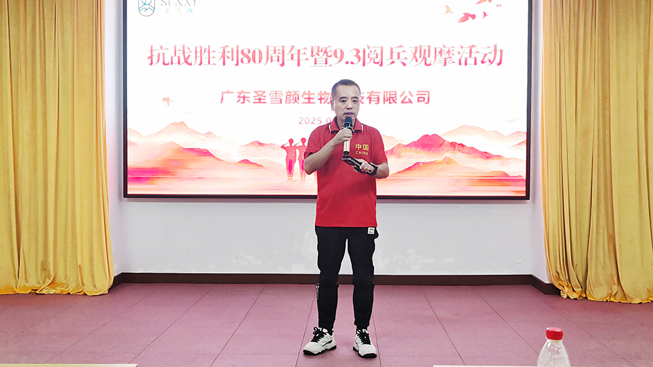2025年9月3日,纪念中国人民抗日战争暨世界反法西斯战争胜利80周年阅兵式在北京天安门广场隆重举行,广东圣雪颜生物科技有限公司组织员工集体观看直播,80余名员工在嘹亮军歌与铿锵步伐中,共同接受爱国主义精神洗礼,凝聚起强企报国的奋进力量。